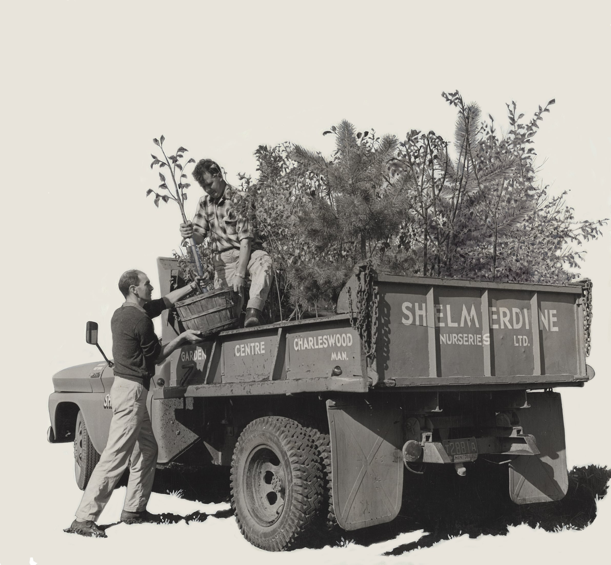 Shelmerdine was founded in 1937 in Charleswood by Walter Shelmerdine. Walter produced fruit trees, which were sold mostly to farmers in the area. In 1944, he increased his market by knocking on doors during the winter months offering to draw landscape plans for homeowners, producing plant catalogues and undertaking landscaping contracts.