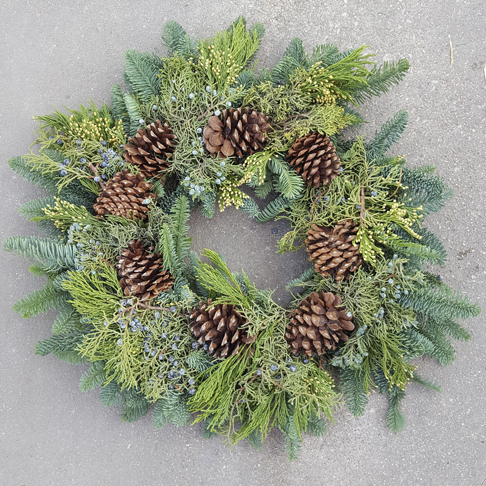 Complete with pine cones, this mixed greens wreath is perfect for your front door or to hang anywhere outdoors. The wreath form is 12″ and outer diameter of greens is approximately 20″.
