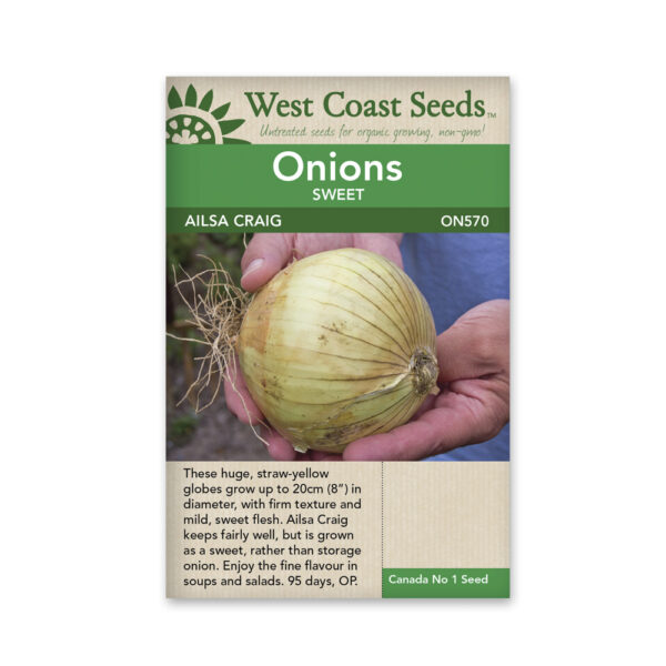 Sow Ailsa Craig sweet onion seeds for huge, straw-yellow globes up to 20cm (8″) in diameter! Firm, with mild, sweet flesh, Ailsa has fairly good short-term storage potential, certainly better than Walla Walla. Ailsa Craig Spanish onions are fine textured, and excellent for salads and sandwiches. It is tolerant of cold weather, so it can be ready for harvest before some other Spanish storage onions. Ailsa Craig was not a person, but rather a place. It is a stony island in the Firth of Clyde in Scotland. While the onion is not from there, it would certainly grow there, as it is adapted for growing between the 38th and 60th parallels, and that makes it an even better onion for northern growers.