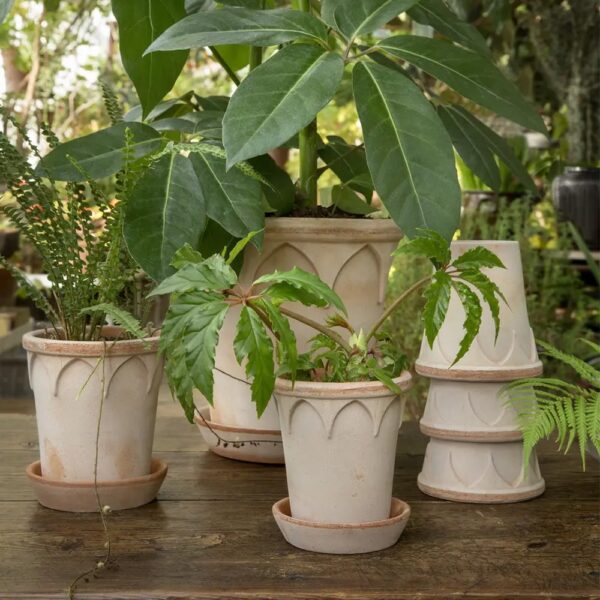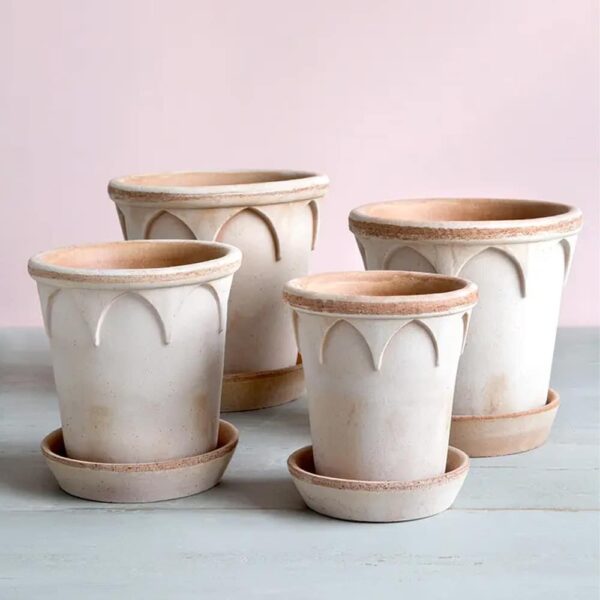 Our Bergs Potter Elizabeth Pot & Sauce in Antique Rose comes from a beautiful collection of Italian Clay Pottery. Like the queen, the Elizabeth pot is durable and elegant. Goth style arches decorate its sides, and form a bold crown when the pot is turned on its head. Whitewashed rose terracotta is a classic neutral tone that complements any plant beautifully. Pair this pot with the corresponding saucer!