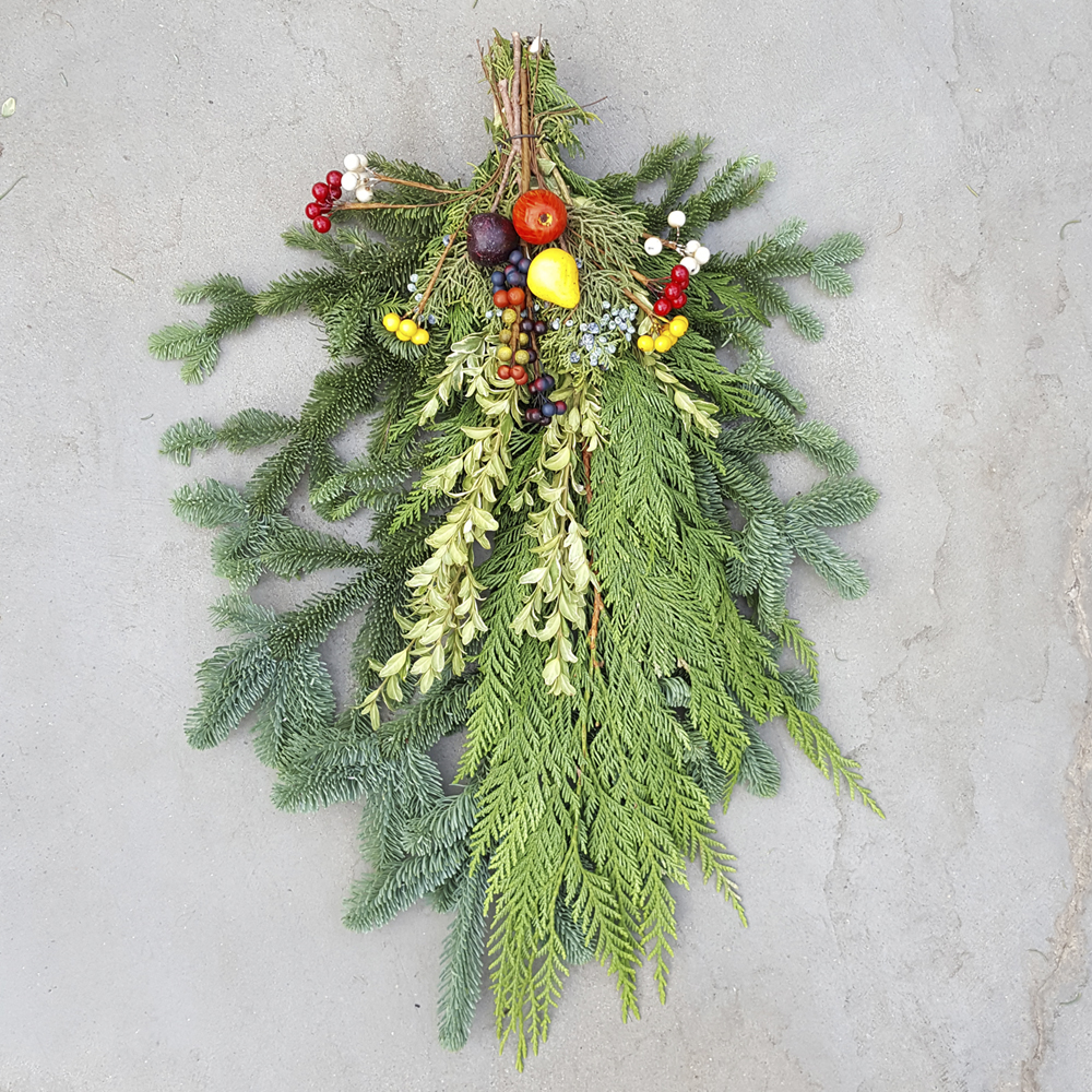 Give your front door the festive treatment with a holiday door swag of mixed greens complete with royal fruits and an assortment of berries.