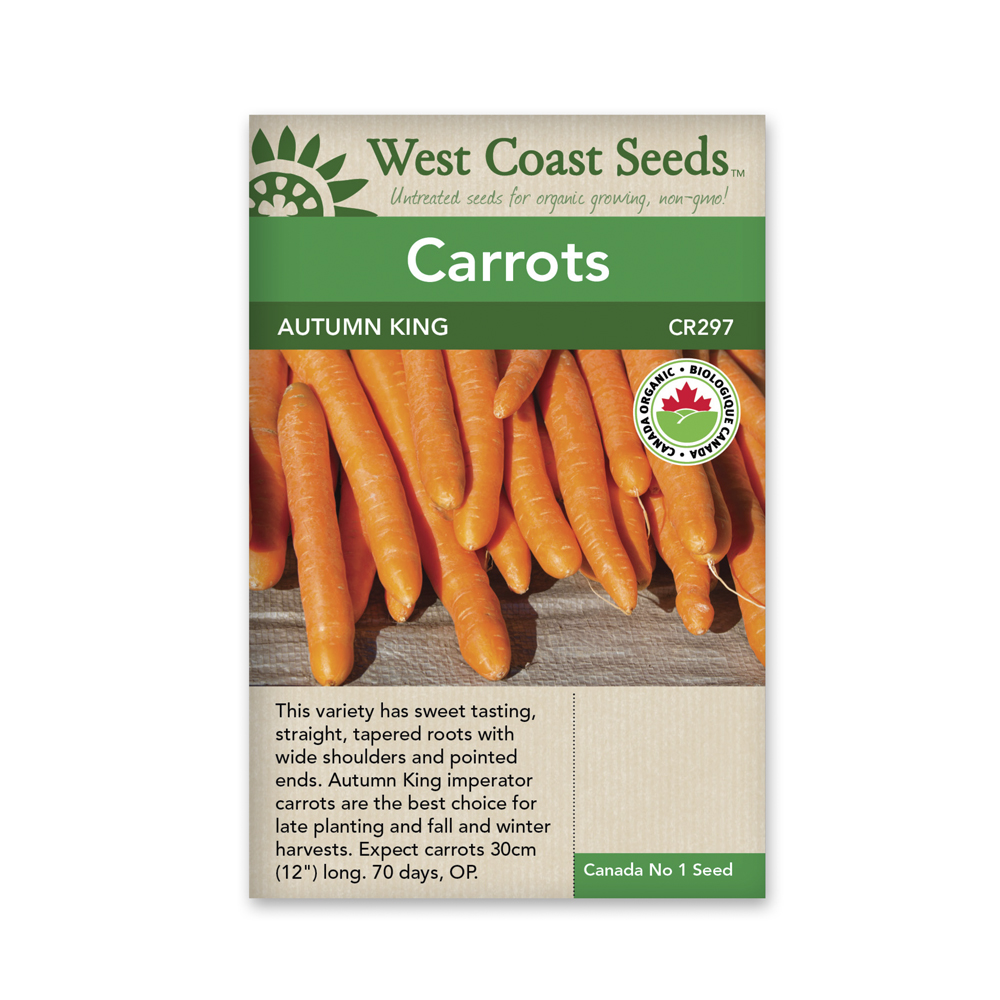 Autumn King Organic carrot seeds are CERTIFIED ORGANIC! Excellent, straight, tapered roots with wide shoulders and a pointed end make Autumn King imperator carrots the best choice for late planting. Expect carrots 25-30cm (10-12″) long. Sow seeds from spring into late August, but cover your later plantings with lightweight row cover to protect from fall carrot rust flies. Harvest right through winter by leaving them in the ground. If heavy frost is forecast, either harvest for winter storage or processing, or mulch with a thick layer of straw. Carrots can also be harvested and stored in a cool place in ground peat moss, sawdust, or sand.