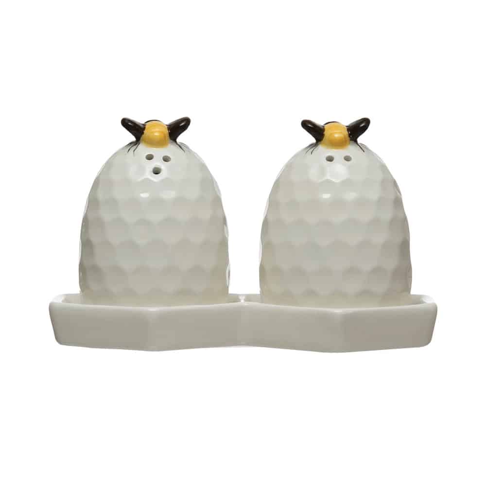 These Beehive Salt and Pepper Shakers are the bees knees. One for salt, one for pepper and a little hexagonal tray to keep them all organized.