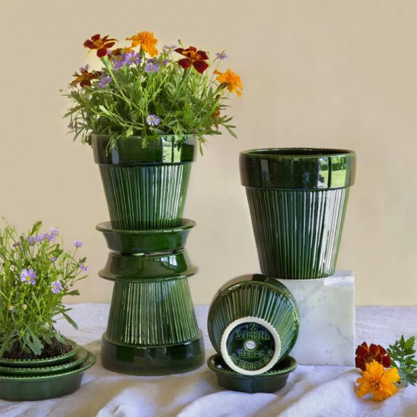 Our Bergs Potter Hoff Pot & Saucer in glazed green is perfect minimalism. Raw terracotta pots allow roots to breathe, plants to thrive, and the creative spirit to grow. Additionally, this glaze, saturated in the intense Emerald Green colour, accentuates the geometrical look and adds a slightly playful dimension that catches the eye. Also available in many other colours. Come shop in store!