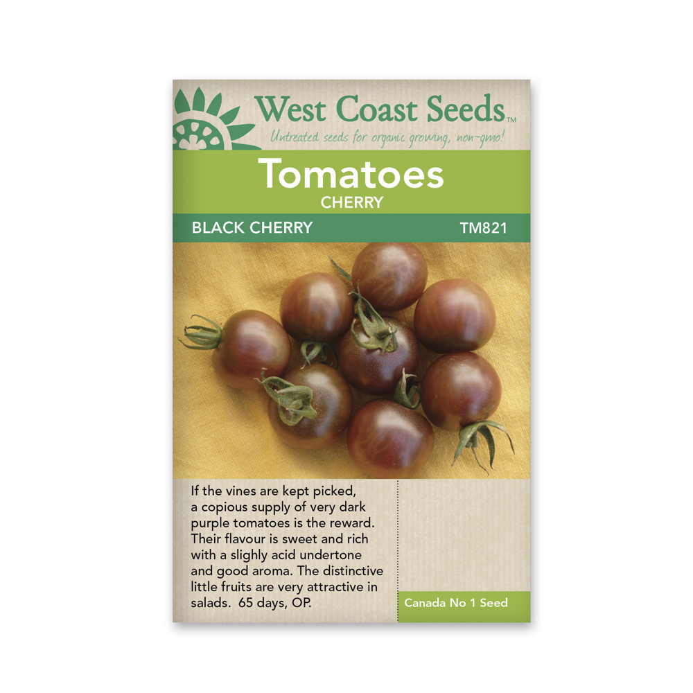 Black cherry tomato seeds are easy to grow, and plants are naturally disease resistant. Vines typically grow at least 150 cm (60″) and require caging or staking for support. For best results, allow these cheery tomatoes to ripen on the vine, and harvest regularly. Fruits are ripe when they turn olive/eggplant in colour and they pop readily off the stem with a roll of the fingers.