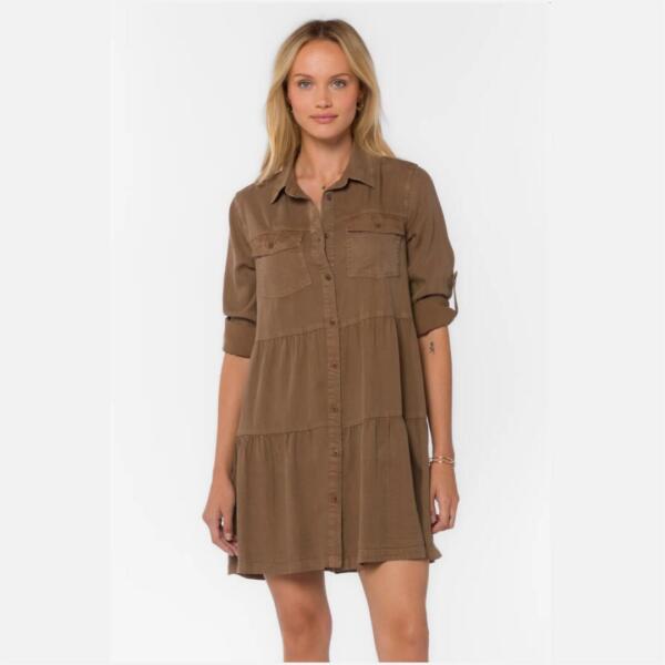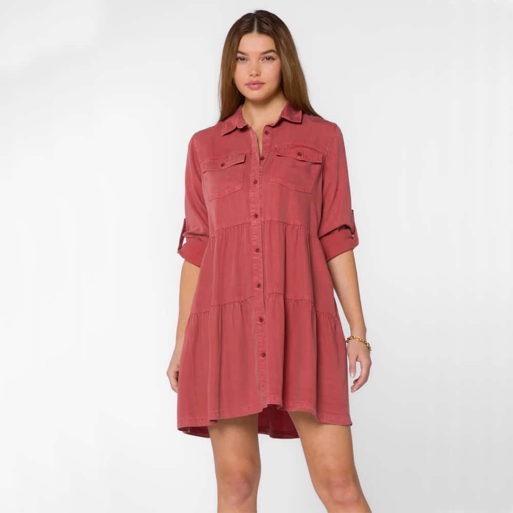 Velvet Heart’s best-selling dress, the Bree Tiered Dress, is a lightweight and flowy button-up babydoll dress. This dress features a basic collar, roll-tab sleeves, front flap pockets, 3 tiered design, and knee-length hem.