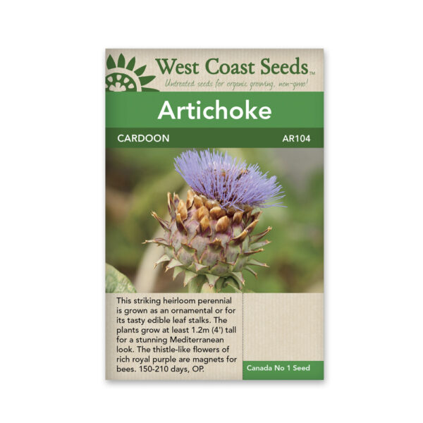 C. cardunculus. This striking perennial heirloom is grown as an ornamental artichoke but its leaf stalks and stems are edible. It grows at least 1.2m (4’) tall for a stunning Mediterranean look with large silvery-green, deeply-cut leaves and thistle-like flowers of rich, royal purple. Its flowers are highly attractive to bees and other pollinators. Thick stems, steamed and seasoned, are an old-world treat. The unopened flower buds make unusual cut flowers.