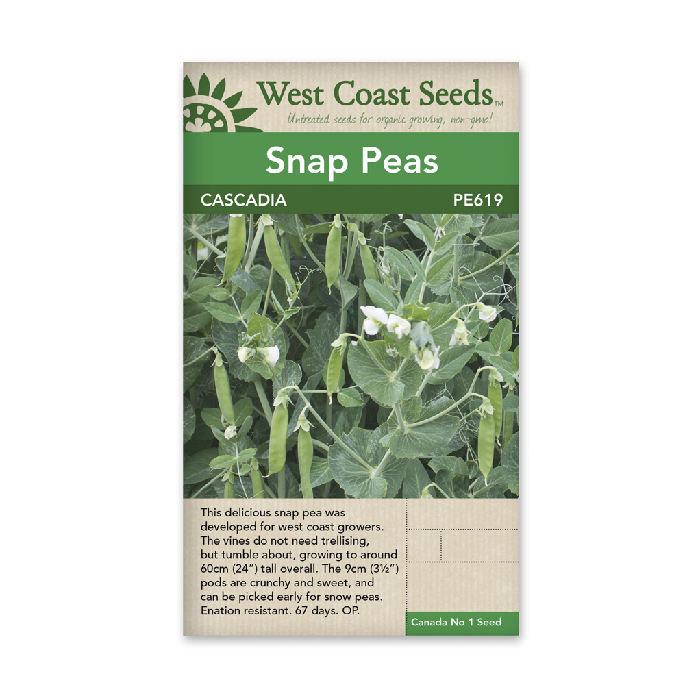 This delicious snap pea was developed just for the West Coast. Cascadia snap pea seeds produce vines that do not need a trellis but tumble about (try putting some twigs in to support them), growing to approximately 60cm (24″) overall. The dark green pods are a nice 9cm (3.5″) long and are crunchy, juicy, and sweet. Cascadia peas are resistant to the enation virus and powdery mildew, so they are good candidates for later sowings and fall harvest here on the coast. Sow as late as July and early August, and you may get a crop as late as October. Winner of the RHS Award of Garden Merit.