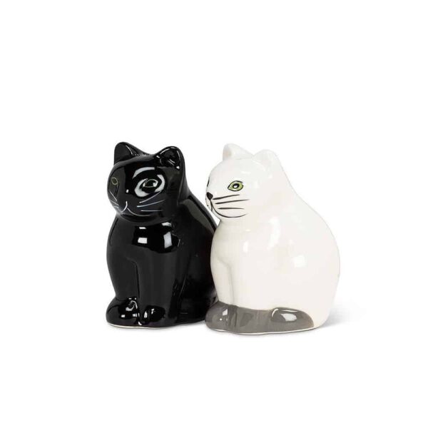 Perfect for pet owners is this handsome duo of cat salt & pepper shakers shaped like cats. Made of ceramic.