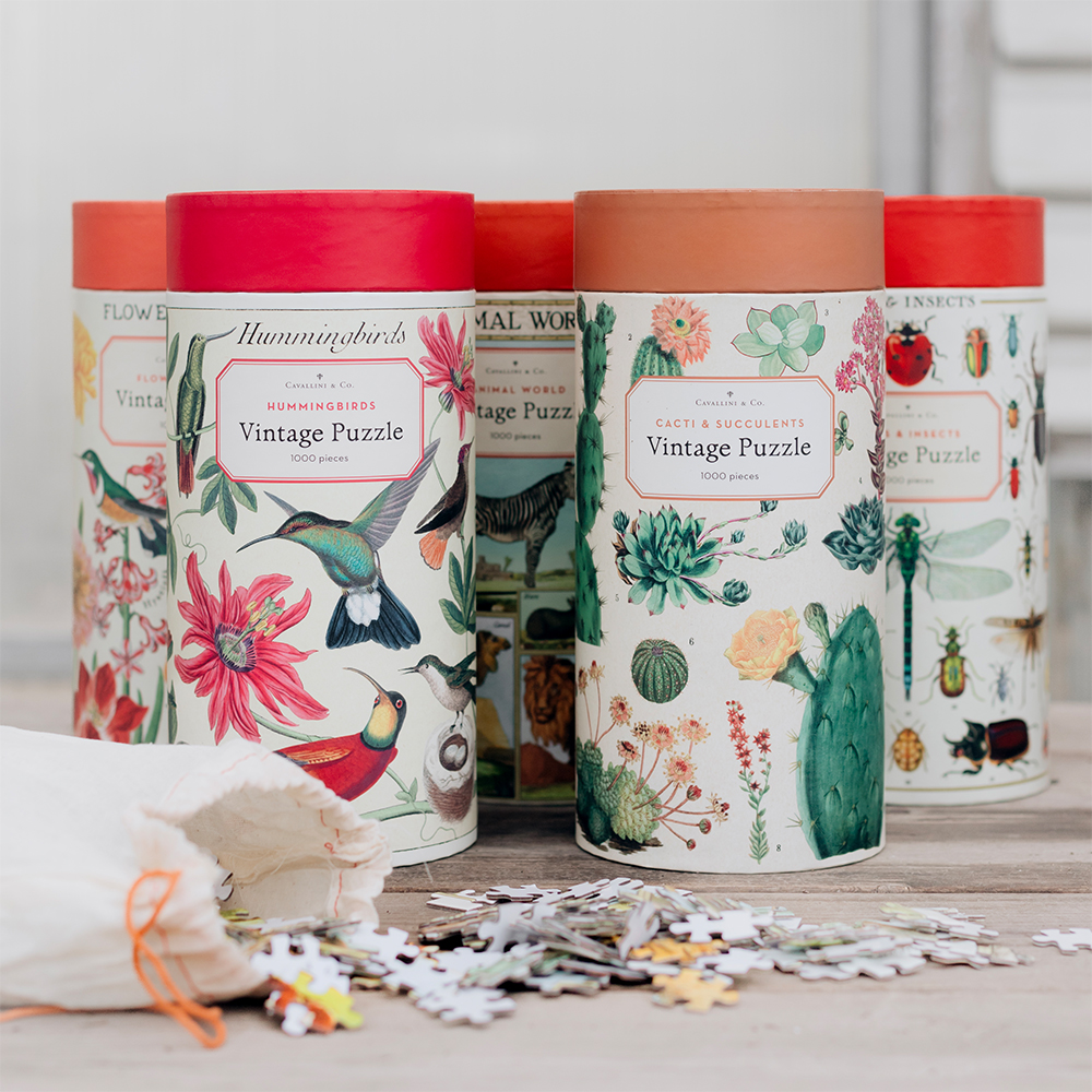 Say hello to your new favorite puzzle! All Cavallini puzzles come packaged in a 10″ puzzle tube and a handy muslin bag to keep all the pieces together. Our plastic-free packaging is just another reason you’ll love these challenging 1,000 piece puzzles.