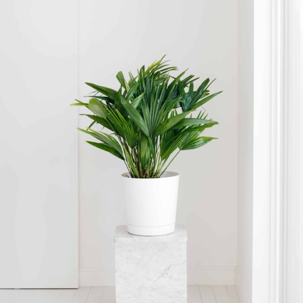 The Chinese Fan Palm is a slow-growing palm that has large fronds which arch over and fan out. They are vibrant green in colour with an accordion-like texture, growing in an upright growth habit on long, slender stems that are slightly serrated. If you’ve got a big sunny window, this palm will feel right at home! In nature, every plant is unique! Your actual plant may vary in size and shape from the pictured plant.
