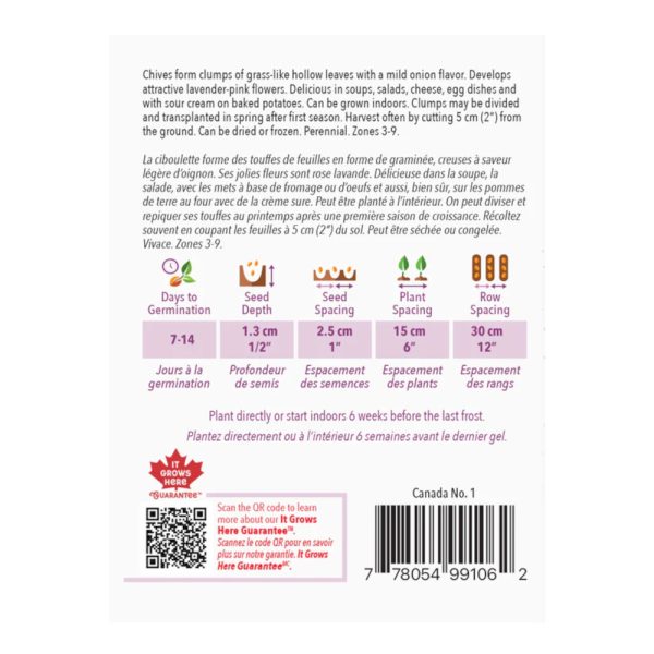 Chives are hollow grass-like leaves with a mild onion flavour. In maturity, it develops attractive lavender flowers. Simply add some chopped chives to soups, salads, cheese, and egg dishes for a quality flavour. Additionally, you can also dry or freeze this versatile herb. A fragrant addition to your meals.