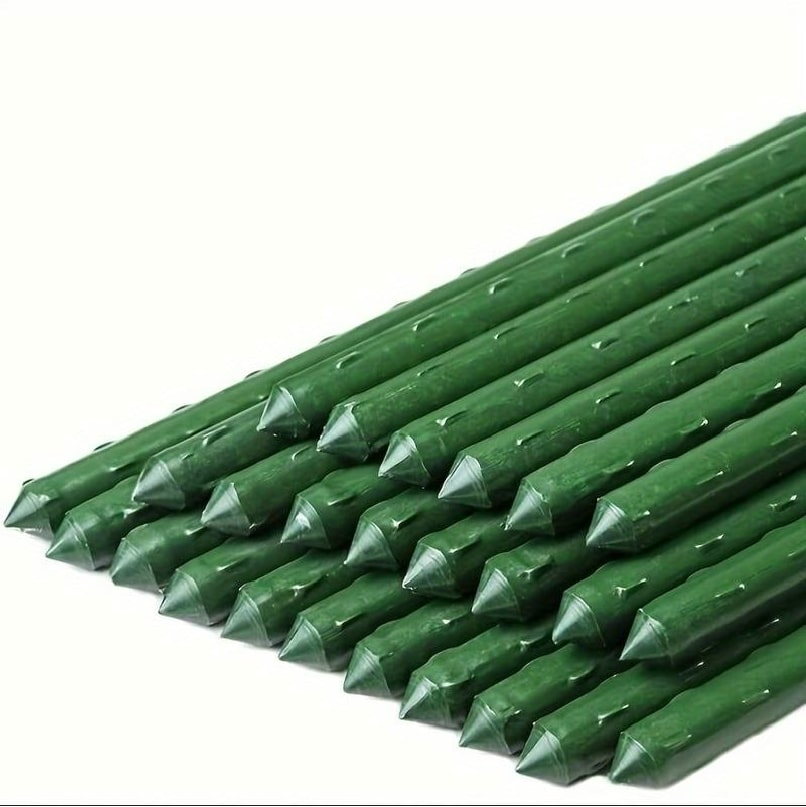Our green plastic Coated Steel Plant Stakes are anti-rust and have a corrosion resistant surface. Use them as an all-purpose plant support to hold climbing plants like tomatoes, cucumbers, and pole beans. Easy to install into soil with the tapered point and a textured surface design that ensures a secure and effective grip. Combine multiple stakes to create a frame or trellis. A gardener’s staple!