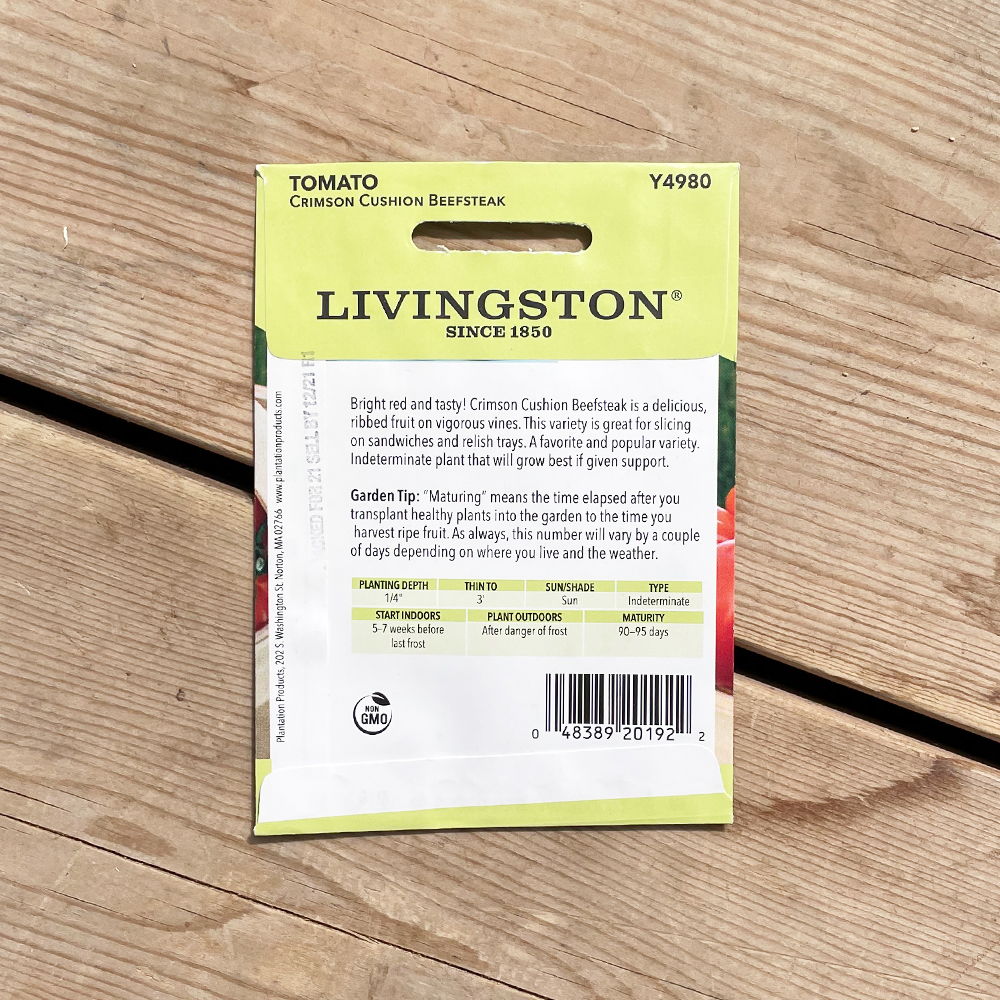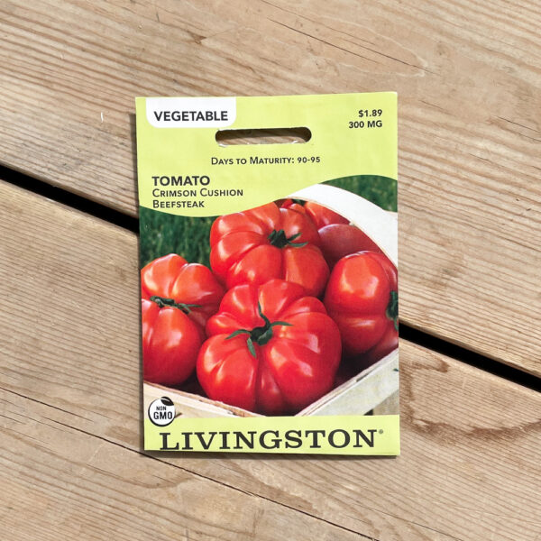 Bright red and tasty! Crimson Cushion Beefsteak is a delicious, ribbed fruit on vigorous vines. This variety is great for slicing on sandwiches and relish trays. A favorite and popular variety. Indeterminate plant that will grow best if given support.