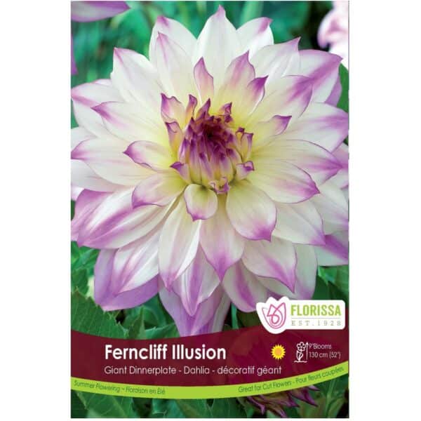 Dahlia Ferncliff Illusion boasts flowers that are 8″ in diameter. Both enthralling and arresting, this creation presents its flower with boldness, in a pure white color with lavender tips. It features whispy petals and grows tall in the garden – up to 5′. Contains 1 bulb per package.