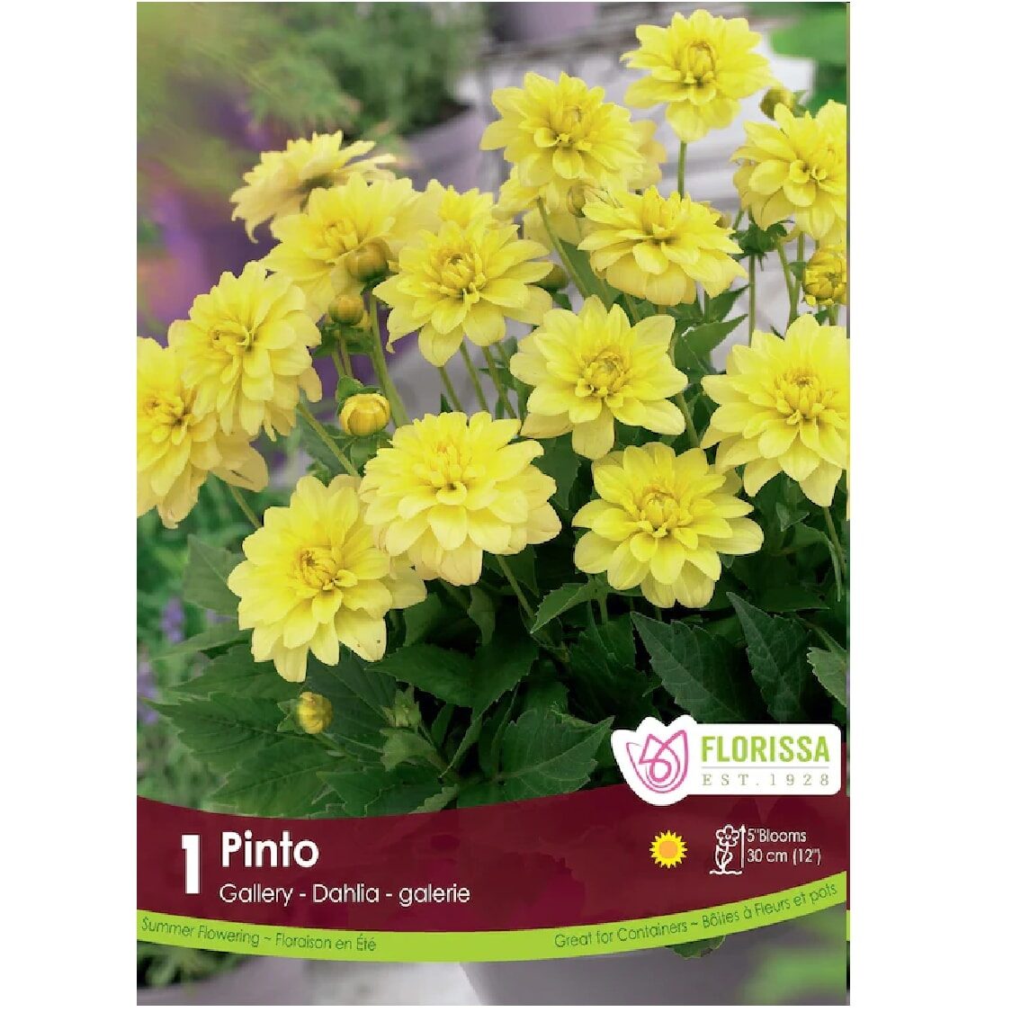 Dahlia Gallery Pinto will give you a gorgeous vibrantly coloured yellow Dahlias, specially developed to be shorter in stature. They’re lovely planted at the front of sunny garden beds and fabulous in containers all gathered together on a sunny deck or patio. Imagine sitting outdoors in the morning, sipping your favourite beverage, and watching these blooms show off all summer long and well into the fall. Short and sweet! These sunshine yellow dahlia blooms reach 5 inches across and flower prolifically throughout the season. Contains 1 bulb per package.