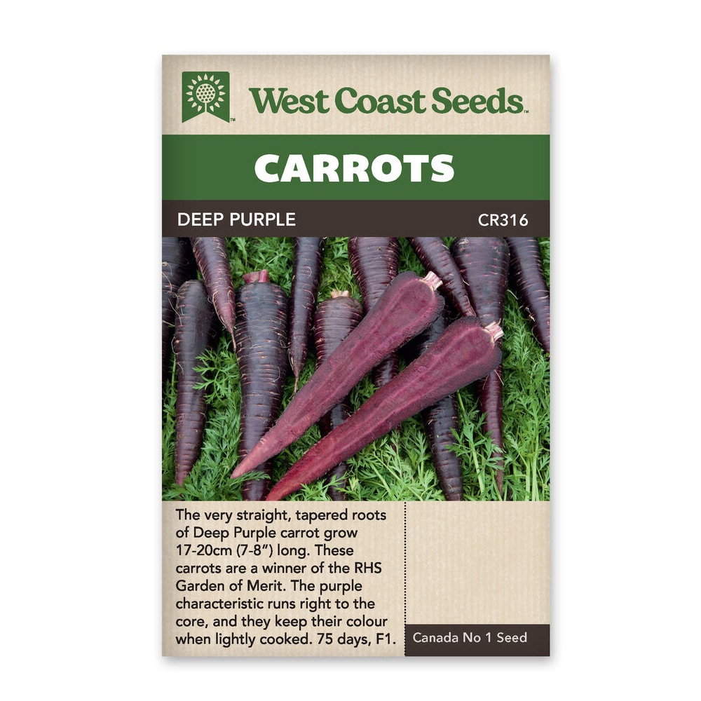 The very straight, tapered roots of Deep Purple Carrot grow 17-20cm (7-8”) long. These carrots are named for the fact that the purple characteristic runs right to the core, and they keep their colour when lightly cooked. The tops are strong for easy harvests, and the storage potential is great. This is a fine fall harvest carrot that is good for juicing and it looks amazing in salads. This is a high yielding, very uniform variety for the market grower or home gardener.
