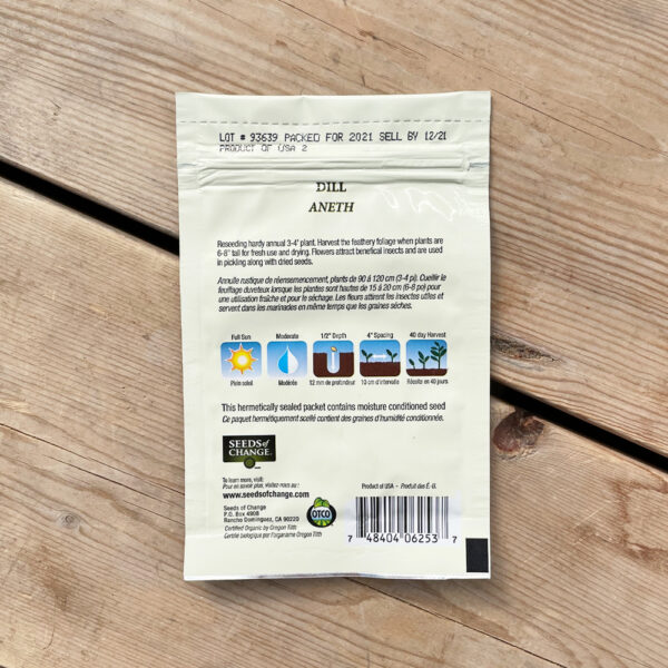 Reseeding hardy annual 3-4′ plant. Harvest the feathery foliage when plants are 6-8″ for fresh use and drying. Flowers attract beneficial insects and are used in pickling along with dried seeds.