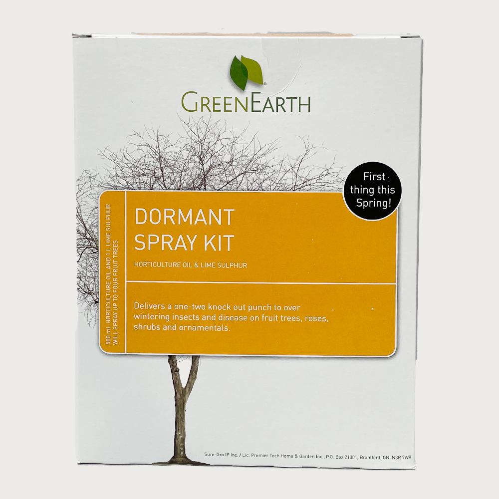 Dormant Spray Kit combines lime sulphur insecticide/fungicide and horticultural oil insect spray. For use on fruit trees, roses and deciduous ornamentals for overwintering insects, eggs, oystershell scale, San José scale, rose scale, blackscale as well as over-wintering fungus disease. Apply in early spring before leaf buds show green at tips. Spray on a day when temperature is over 5 degrees Celsius.