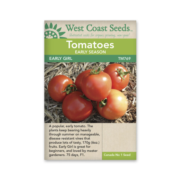 Choose Early Girl tomato seeds for a fast and early crop of delicious medium-sized red tomatoes. This is an early maturing variety for coastal grower. The plants keep bearing fruit heavily throughout the summer on manageable, disease resistant vines, producing baskets of tasty, 110-170g 4-6 oz) tomatoes. Early Girl is resistant to Fusarium wilt races 1 and 2. Some coastal growers choose early maturing tomatoes as a way to beat Late Blight. The disease usually strikes mid- to late summer, and by that time Early Girl has already produced the bulk of her fruit.