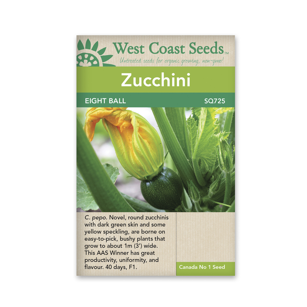 C. pepo. Eight Ball is a novel, round zucchini with dark green skin and some yellow speckling, borne on an easy-to-pick, bushy plant that only grows to about 1m (3′) wide. Eight Ball zucchini seeds are an All America Selections Winner with great productivity, uniformity, and flavour. Harvest only a day or so after pollination for tender, exotic looking, spherical zucchinis with just the right tender texture and mild taste. Eight Ball is a good candidate for large containers or raised beds, and will produce lots of fruits over several weeks if plants are regularly picked. Provide fertile soil, and use a balanced organic fertilizer at transplant time.