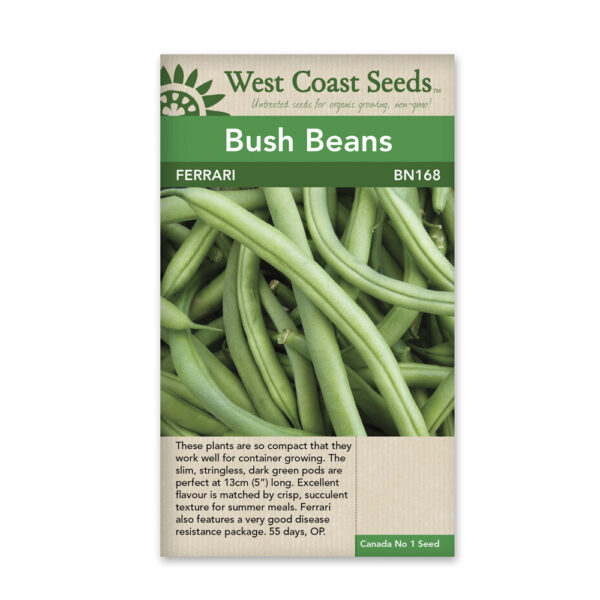 Ferrari is considered a French filet type bean and has a wonderful flavour. The slim, stringless, round pods develop early on compact plants, and grow to 13cm (5”). This variety has good potential for early starting under cloche protection, and is compact enough for container growing. Ferrari bush bean seeds are resistant to Anthracnose and BCMV, and tolerant to Cucumber Mosaic Virus.