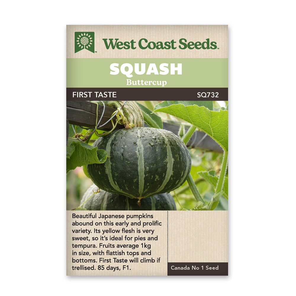 Beautiful First Test Kabocha Squash develop on this early maturing and prolific variety. Its yellow flesh is very sweet, so it’s ideal for pies and tempura. First Taste Kabocha squash seeds fruits average 1kg in size, with flattish bottoms and tops. Plan on multiple harvests from late summer to frost! First Taste kabocha squash grows well on trellises or along a fence. But it can also sprawl on the ground. Be sure to check frequently for early developing fruits.