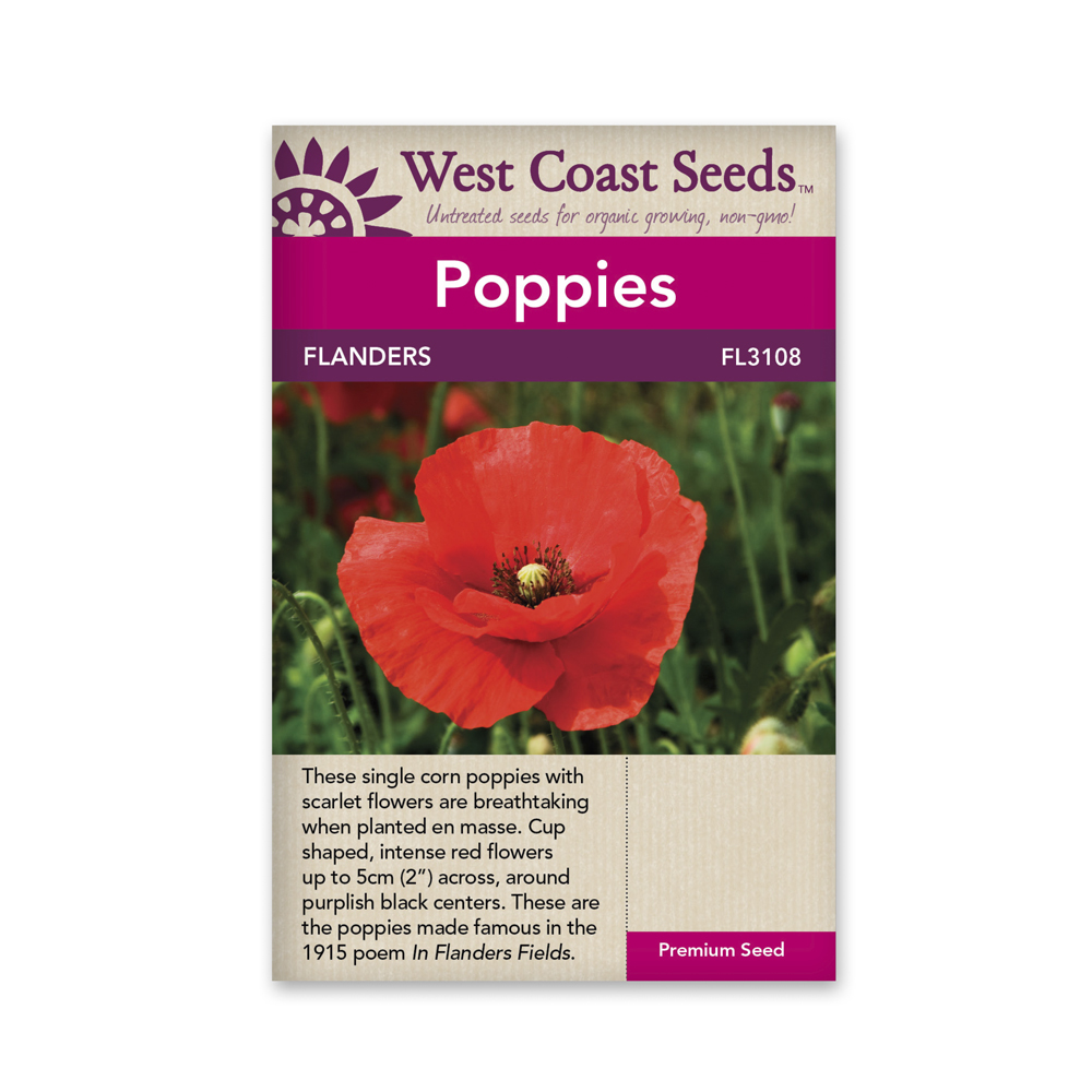 Papaver rhoeas. Sow heirloom Flanders poppy seeds for bright red summer colour in nearly any soil. Flanders poppies are quite drought tolerant, so they are useful in xeriscaping schemes. They self sow fairly reliably without ever becoming weedy. It’s a good choice for any areas where grasses are allowed to grow tall in summer, with the poppies growing to around 60cm (24″) tall. Gather the dried seed heads in late summer for decorative dried flower arrangements. Plants produce abundant tiny seeds that are very easy to gather and give as gifts. This species is mildly toxic to grazing animals, but its acrid taste puts most animals off anyway. So it is a very useful deer resistant variety that looks spectacular when planted in large areas.