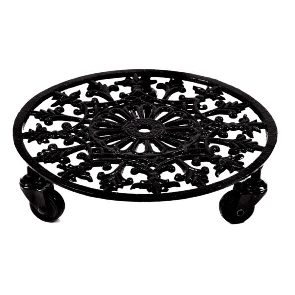 Move plants around your house with ease using the fleur de lys plant caddy! We love the fleur de lys motif, and that its made from a heavy gauge steel with a powder coat finish in black. This caddy is 15 inches in diameter with 4 castors.