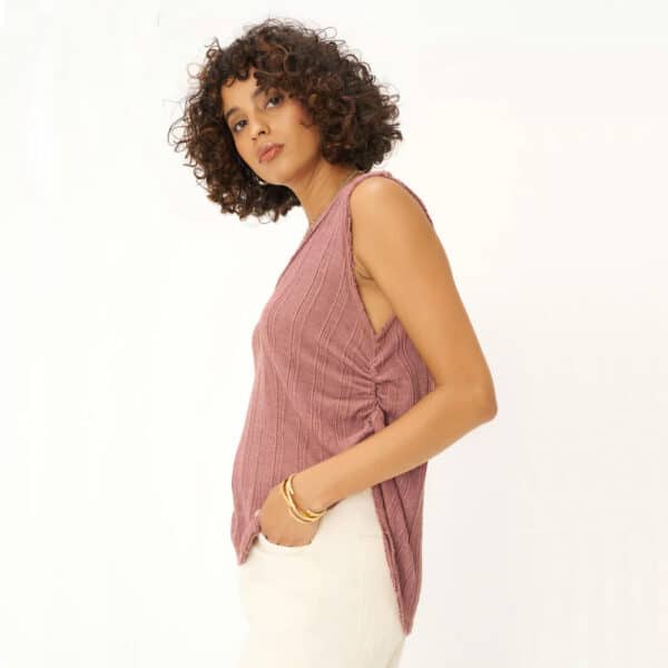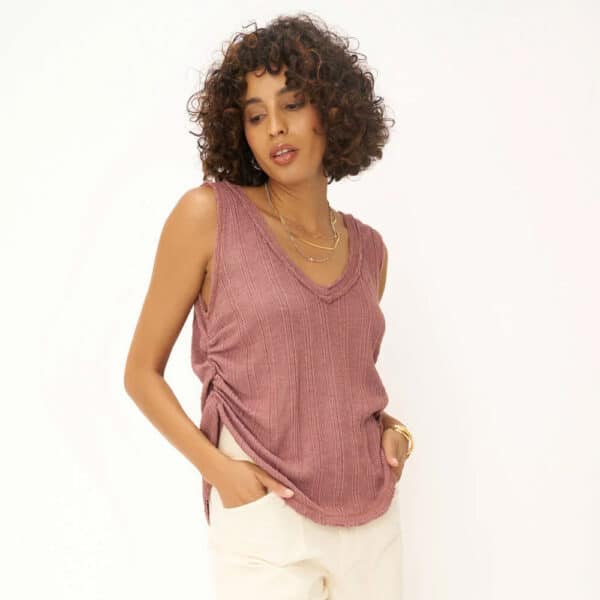 Our Float Away Tank is perfect if you’re on the hunt for something that’s feminine yet casual. It features a textured stripe fabric that drapes in all the right places thanks to the flattering, v-neckline, and ruched sides. Added details like exposed stitching and raw edges set this one apart. Pair with some white jeans for a refreshingly seasonal look.