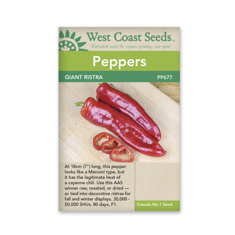 F1, 80 days. For chilies, these are substantially large. At 18cm (7”) long, Giant Ristra looks like a Marconi type, but it has the genuine heat of a cayenne. This All America Selections Winner can be used fresh, roasted, or dried – or tied into decorative ristras for winter displays. The heat development was better than some of the other varieties in our field trials. Spice lovers will adore its tear-inducing 30,000-50,000 SHUs. One of the winning qualities is that the plants are tall enough that very few of the pods reach the ground, even though they are so large.