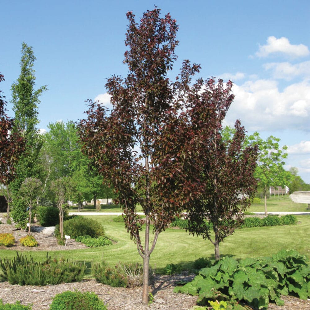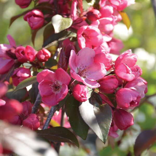 Gladiator Rosybloom Crabapple is an excellent ornamental tree with a profusion of bright pink, showy flowers in the spring followed by small reddish-purple fruit. The deep purple foliage becomes burgundy in the spring and turns yellow in the fall. Its upright habit of growth makes this tree a great vertical accent for any garden. Gladiator Rosybloom Crabapple is disease-resistant and will grow to be about 20′ tall at maturity, with a spread of 13′. This tree should only be grown in full sunlight and is drought tolerant once established.