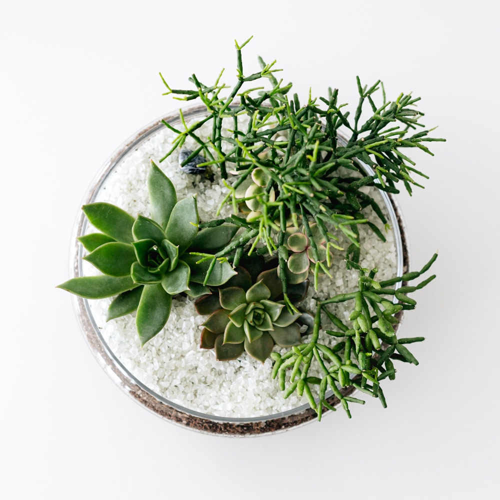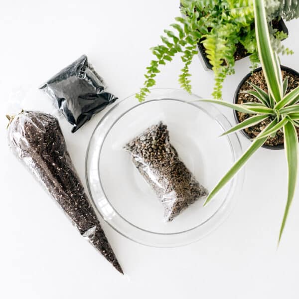 Follow these steps to build your terrarium layers. First, create a drainage layer using a 1-inch base of washed and dust-free drainage stones for proper drainage. Second, add a thin layer of horticultural charcoal to keep the soil fresh. Charcoal also helps to absorb any sitting water and prevents odors and bacteria from forming. Third, create a layer of general purpose potting mix that contains a combination of coco fiber, sphagnum moss, orchid bark, charcoal, and worm castings.