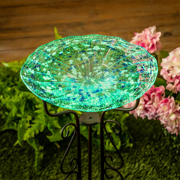 Light up your back yard at night with the glow in the dark bird bath. Made from a tempered glass, this mosaic inspired fused bowl looks beautiful both in the day and night time.