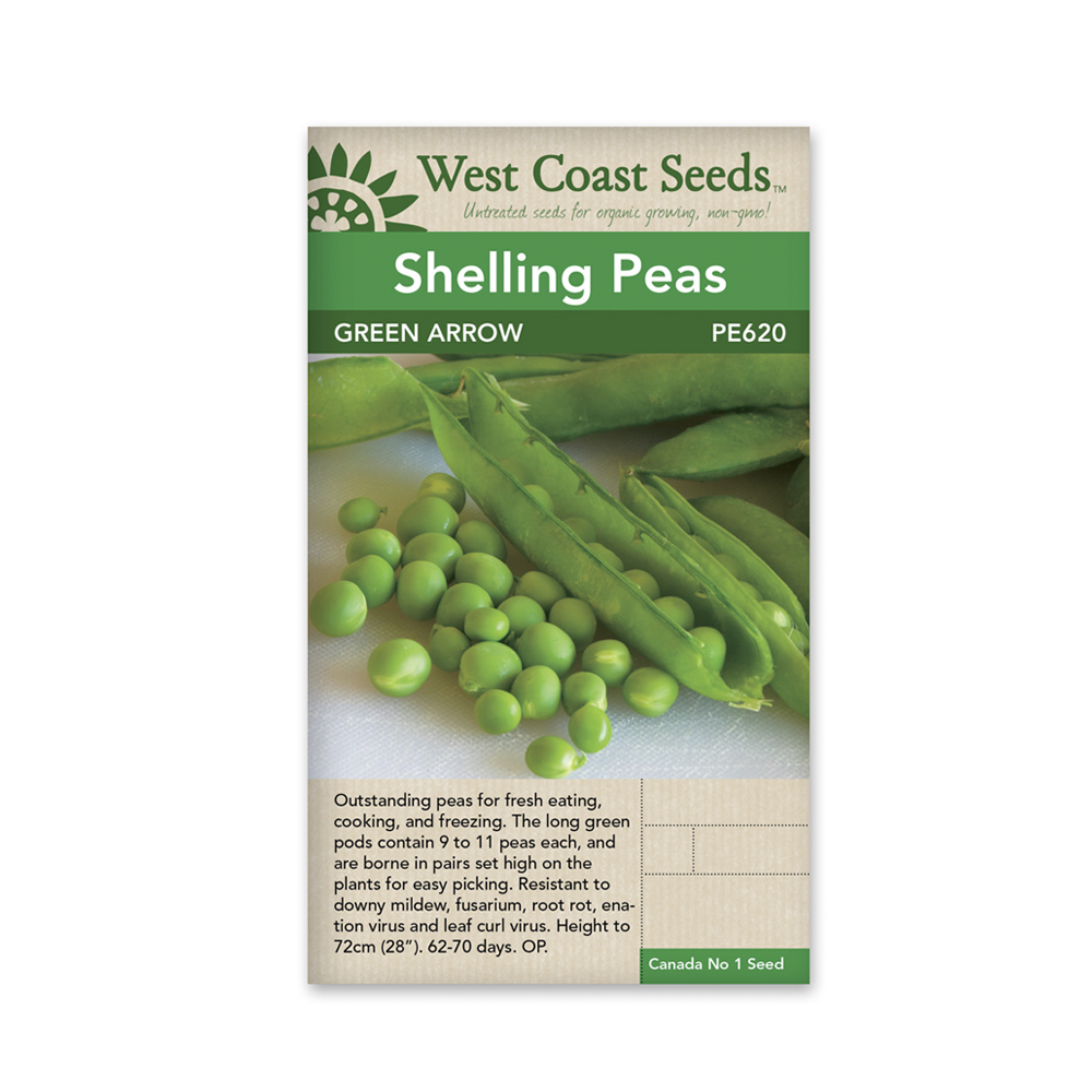 Green Arrow shelling pea seeds. These are excellent for fresh eating, freezing, canning, or cooking. Born in pairs at the top of the short bush are heavy yields of dark green pods to 11cm (4.5″) containing 9 to 11 peas each. The peas themselves are tender and sweet and the 70cm (28″) plants are resistant to enation, Fusarium wilt, root rot, Leaf Curl virus (LCV), and downy mildew, so they are ideal for coastal gardens.