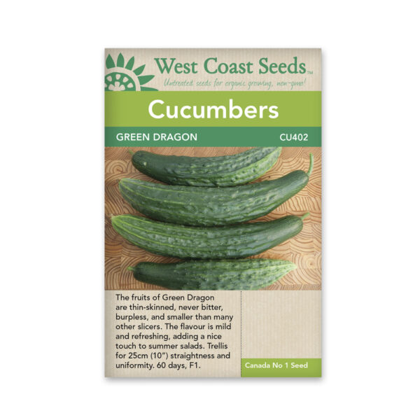 Green Dragon cucumber seeds produce vines with substantial fruits to 28cm (11″) long. The fruits have linear indentations and tiny white spines that can easily be brushed off using a tea towel or similar cloth. Thin, dark green skins cover really tasty flesh that is burpless and never bitter. Green Dragon performs well both outdoors and in the greenhouse, but provide a trellis in either case so that the fruits can hang as they grow for better straightness. This variety is hybrid resistance to Cucumber Mosaic Virus (CMV), powdery mildew, downy mildew, and scab. For container growing, choose pots at least three to five gallons per plant, with fertile soil and good drainage.