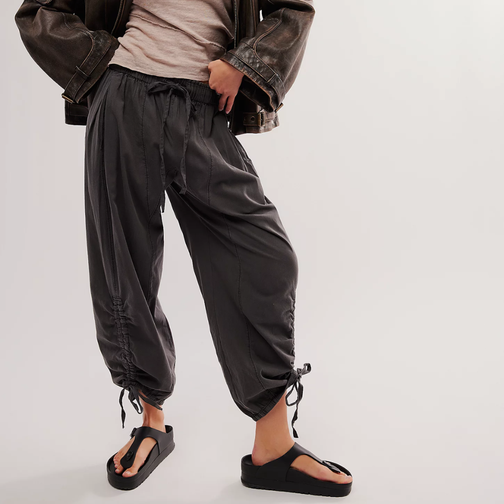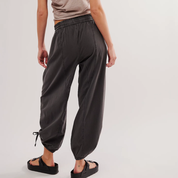 Features: Pull-on design, drawstring closure, cinch tie detailing at the hems, side pockets