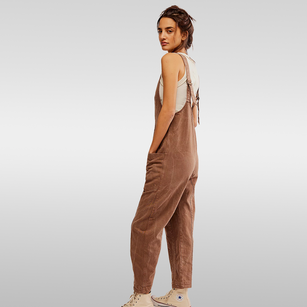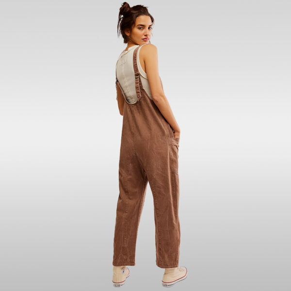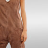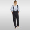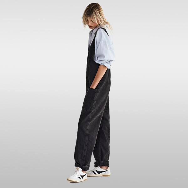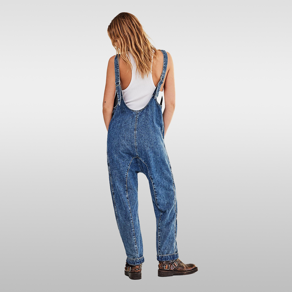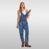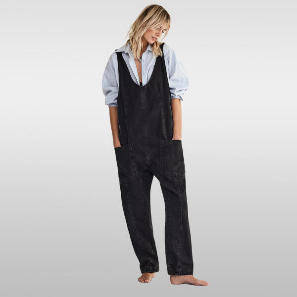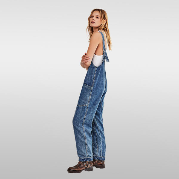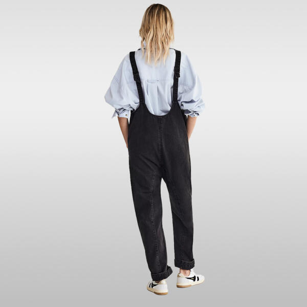 Features: Denim fabrication, rigid feel, low scoop neckline, seam detail throughout, oversized patch pockets, drop-crotch harem-style legs, low back with adjustable shoulder straps