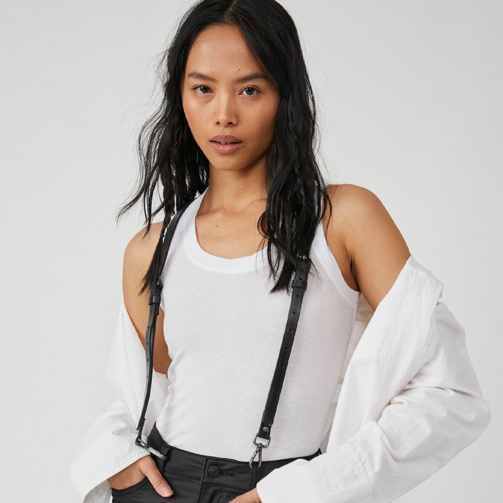 Add a menswear-inspired touch to any look with these so sophisticated hold me up suspenders featured in a buttery soft leather and thin style with adjustable shoulder straps, buckle detailing, and three clasp closures.