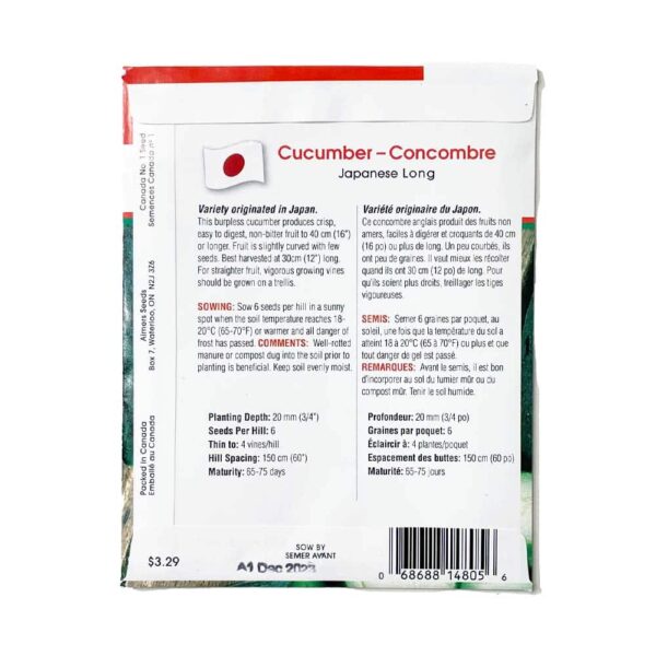 Japanese Long Cucumber is a burpless cucumber that produces crisp, easy to digest, non-bitter fruit to 40cm or longer. Fruit is slightly curved with few seeds. Best harvested at 30cm long. For straighter fruit, vigorous growing vines should be grown on a trellis.