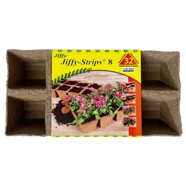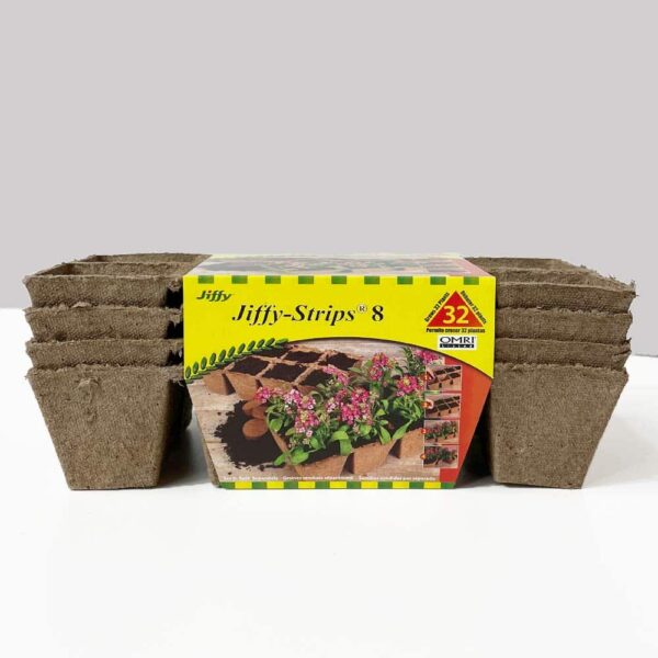Start your seeds in these biodegradeable peat strips. Each Jiffy strip has 8 spots for planting and you get 4 strips! So you can plant up to 32 seeds! Once your plants are ready to go outside, you can plant them, pot and all, completely covering the peat pot
