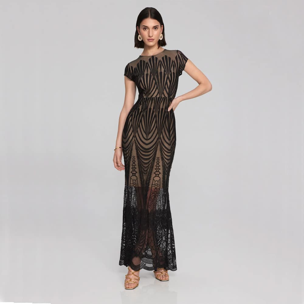 I think we can all agree this Joseph Ribkoff Sheer Lace Dress is a stunner. Look no further for your next black tie event. With a delicate cap sleeve and a mermaid style bottom, this dress is understated, but allows your natural beauty to shine through.
