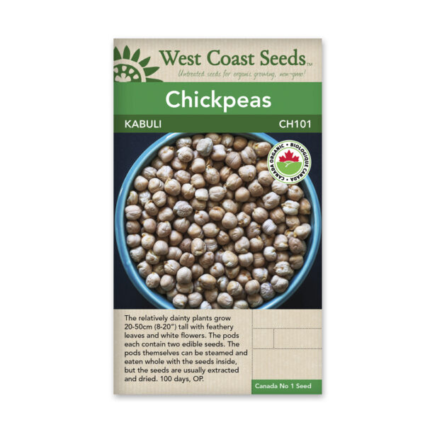 CERTIFIED ORGANIC! Cicer arietinum. The humble Kabuli chickpea is a staple food crop all over the world, and has been in cultivation for over 7,500 years. Its subtle flavour makes and excellent vehicle for garlic, herbs, and spices and it is an excellent source of protein, fibre, and minerals. The relatively dainty plants grow 20-50cm (8-20″) tall, with feathery leaves and white flowers that may be streaked with pink or blue. The pods each contain two (occasionally three) edible seeds. The pods themselves can be steamed and eaten whole with the seeds inside, but the seeds are usually extracted and dried. The seeds can be sprouted, dried, eaten fresh, and even pounded into gram flour (besan). As a legume, the plant fixes nitrogen in the soil, which makes it suitable as a cover crop or companion plant. Note that each plant only forms a few pods, so numerous plants are needed for large production.