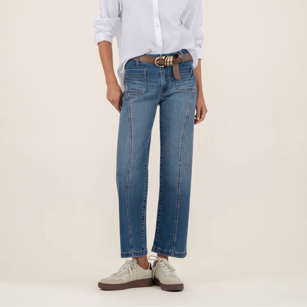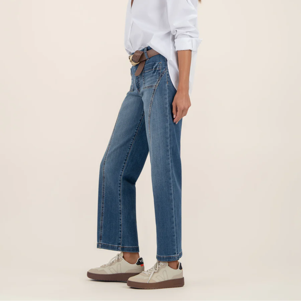 These high-rise wide-leg jeans in a classic medium wash feature patch pockets and a front seam detail for a structured, modern silhouette. Perfect for effortless style with a tailored edge.