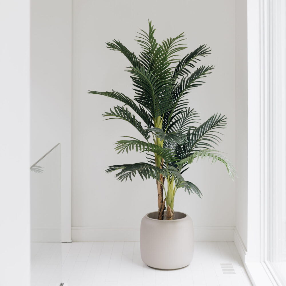 If you’ve got a dark area in your home or office, you’re not a plant person, or you travel a lot, a lifelike plant such as our Lifelike Areca Palm Plant is just the solution for you! It doesn’t require any maintenance, except for the occasional dusting. On trend and very realistic looking, this lifelike plant will breathe life into any space. Measures 66″ in height. Comes in a black plastic pot.