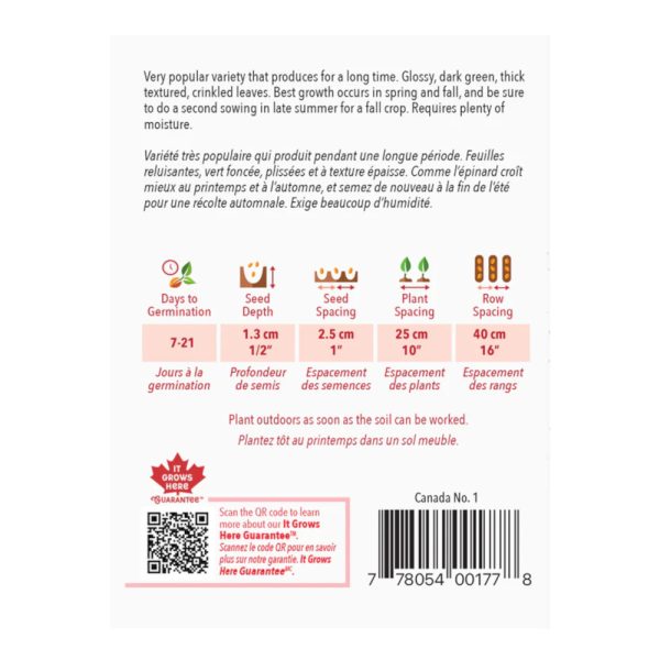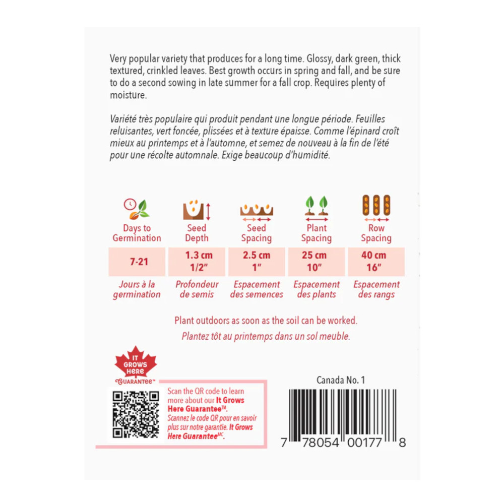 Long Standing Bloomsdale Spinach is a very popular variety that produces for a long time. Glossy, dark green, thick textured, crinkled leaves are rich in Iron. Sow to bolt and go to seed. This cool weather vegetable is easy to grow in rich, well-drained soil. Best growth occurs in spring and fall SO be sure to do a second sowing in late summer for a fall crop. Requires plenty of moisture.