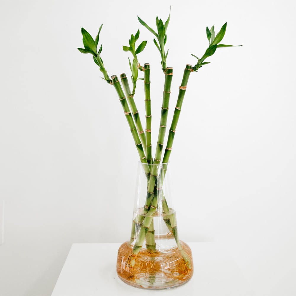 WATER If you choose to grow your bamboo in water, make sure the roots always stay covered with water. Replenish your lucky bamboo with fresh water every seven to 10 days to keep it happy and healthy.