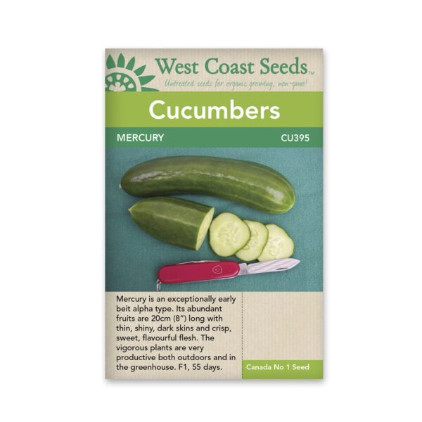 This was a real standout in our cucumber trials for both flavour and productivity. Choose Mercury cucumber seeds for exceptionally early beit alpha type cucumbers. The fruits are 20cm (8″) long with thin, shiny, dark skins, and crisp, sweet, flavourful flesh. The seeds are small in a tight seed cavity. Plants are very productive both outdoors and in the greenhouse, but were bred with open field growing in mind. Lots of fruits develop on each plant in one relatively concentrated set. They are suitable for pickling when picked immature, but they make fine slicers at full size.