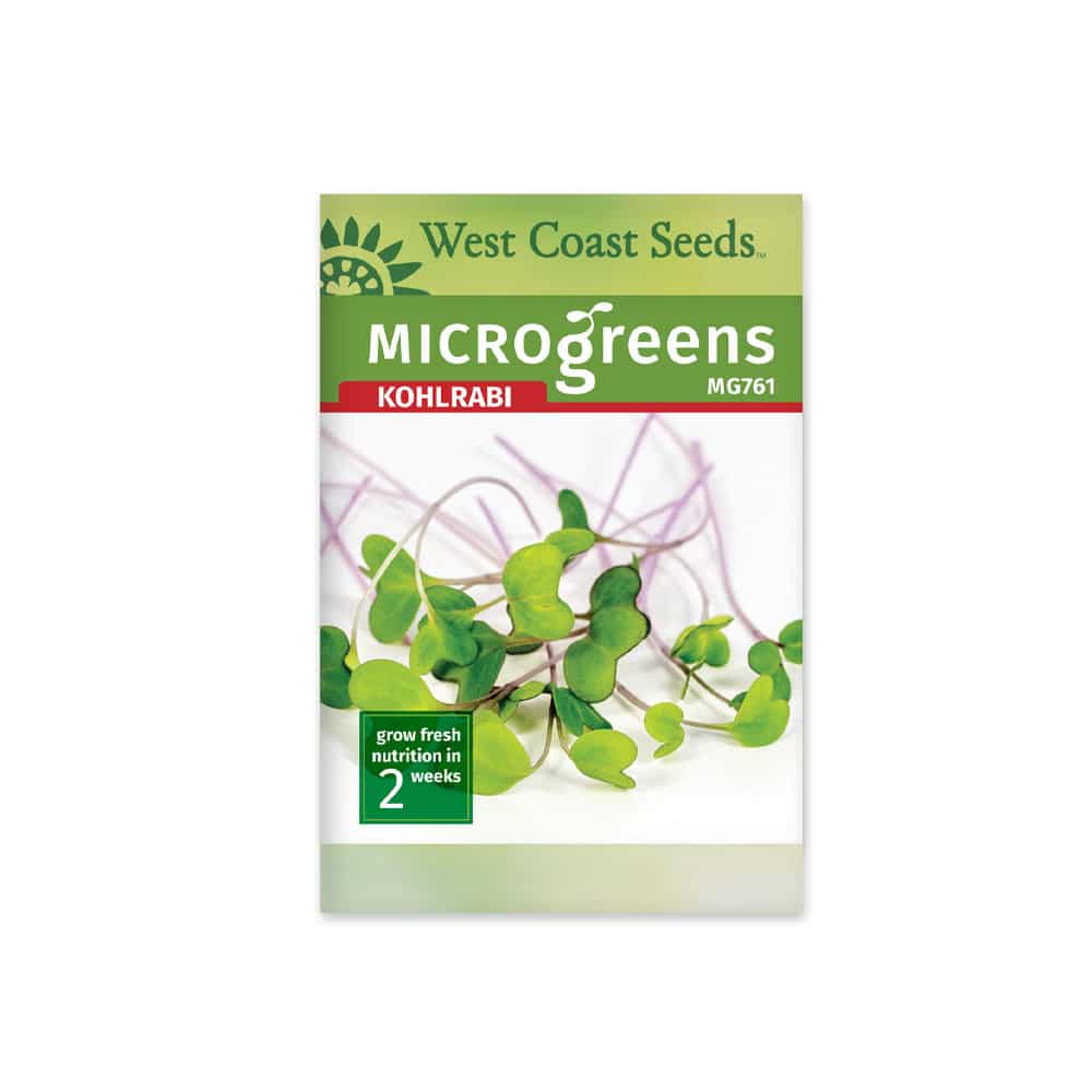 Plant microgreen kohlrabi seeds and grow one of the most nutritious super-foods known. They are high in vitamins A, B, C, E, and K, as well as calcium, iron, magnesium, phosphorus, potassium, zinc, carotene, amino acids, and protein. They also contain sulphoraphane, a compound thought to have powerful cancer fighting qualities. Their bright colour and mild flavour make them a great combination with other microgreens. Microgreen kohlrabi seeds are easy to grow – and fast! Start them on the surface of (or just buried in) sterilized seed starting mix, and keep moist. Once the first true leaf pair emerges, they can be harvested at any point.