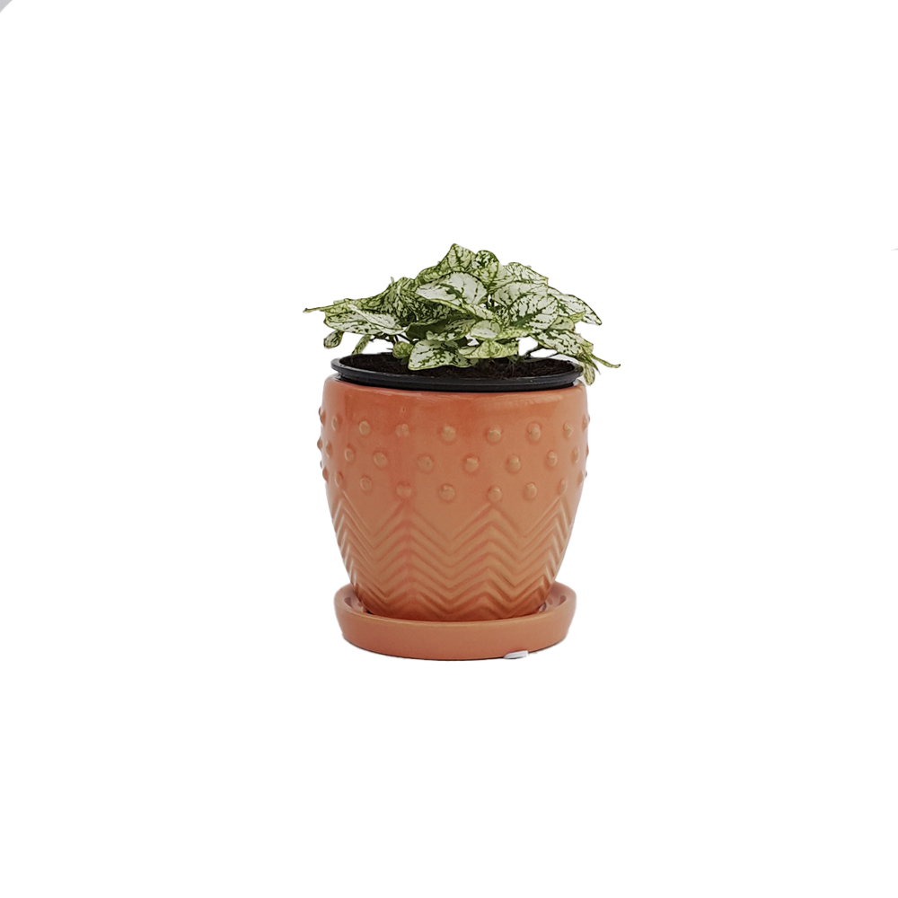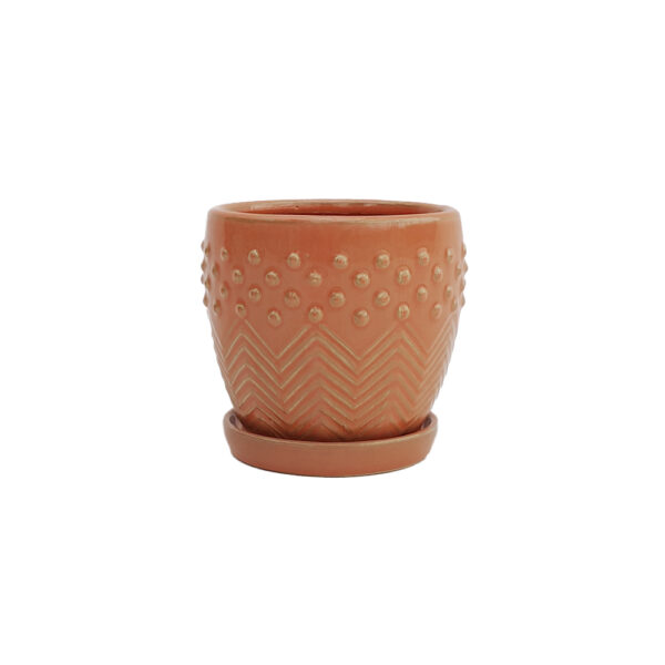 This milton coral pot is the perfect addition to any plant lovers collection! Featuring a glossy finish, with an eye-catching raised dot and etched zigzag pattern.